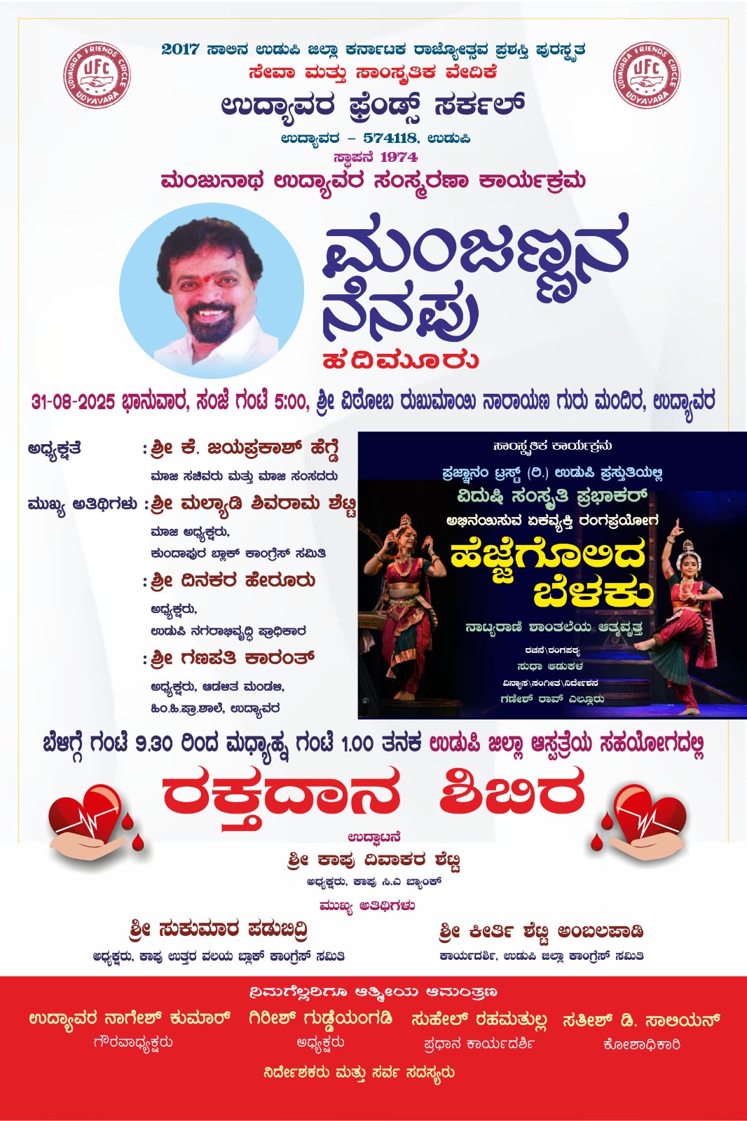 ಉದ್ಯಾವರ: 2017 ಸಾಲಿನ ಉಡುಪಿ ಜಿಲ್ಲಾ ಕರ್ನಾಟಕ ರಾಜ್ಯೋತ್ಸವ ಪ್ರಶಸ್ತಿ ಪುರಸ್ಕೃತ ಸೇವಾ ಮತ್ತು ಸಾಂಸ್ಕೃತಿಕ ವೇದಿಕೆ ಉದ್ಯಾವರ ಫ್ರೆಂಡ್ಸ್ ಸರ್ಕಲ್ ಆಶ್ರಯದಲ್ಲಿ ಉದ್ಯಾವರ ಗ್ರಾಮದ ಅಭಿವೃದ್ಧಿ ಹರಿಕಾರ , ಸಾಮಾಜಿಕ ಕಾರ್ಯಕರ್ತ ,ಸಂಸ್ಥೆಯ ಗೌರವಾಧ್ಯಕ್ಷರಾಗಿದ್ದ ಮಂಜುನಾಥ ಉದ್ಯಾವರ ಅವರ ಸಂಸ್ಮರಣ ಕಾರ್ಯಕ್ರಮ' ಮಂಜಣ್ಣ ನೆನಪು ಹದಿಮೂರು' ತಾ. 31.08.2025 ಭಾನುವಾರ ಉದ್ಯಾವರ ಶ್ರೀ ವಿಠೋಬ ರುಖುಮಾಯಿ ನಾರಾಯಣ ಗುರು ಮಂದಿರದಲ್ಲಿ ಜರಗಲಿದೆ.