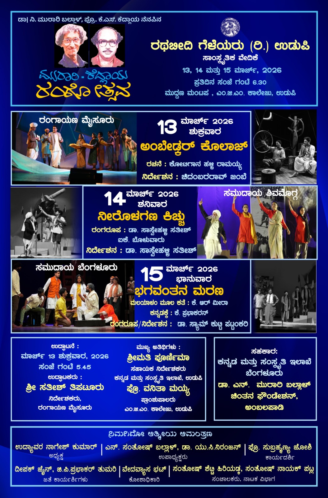 ಮಾರ್ಚ್ 13 ಶುಕ್ರವಾರ 2026,ಸಂಜೆ ಗಂಟೆ 5.45ಕ್ಕೆ ರಂಗೋತ್ಸವವನ್ನು ಮೈಸೂರು ರಂಗಾಯಣದ ನಿರ್ದೇಶಕರಾದ *ಶ್ರೀ_ಸತೀಶ್ ತಿಪಟೂರು* ಅವರು ಉದ್ಘಾಟಿಸಲಿದ್ದಾರೆ.ಮುಖ್ಯ ಅತಿಥಿಗಳಾಗಿ ಕನ್ನಡ ಮತ್ತು ಸಂಸ್ಕೃತಿ ಇಲಾಖೆ ಉಡುಪಿ ಜಿಲ್ಲೆಯ ಸಹಾಯಕ ನಿರ್ದೇಶಕರಾದ *ಶ್ರೀಮತಿ_ಪೂರ್ಣಿಮಾ* ಮತ್ತು ಉಡುಪಿ ಎಂ.ಜಿ.ಎಂ.ಕಾಲೇಜು ಪ್ರಾಂಶುಪಾಲರಾದ *ಪ್ರೊ.ವನಿತಾ ಮಯ್ಯ* ಭಾಗವಹಿಲಿದ್ದಾರೆ .