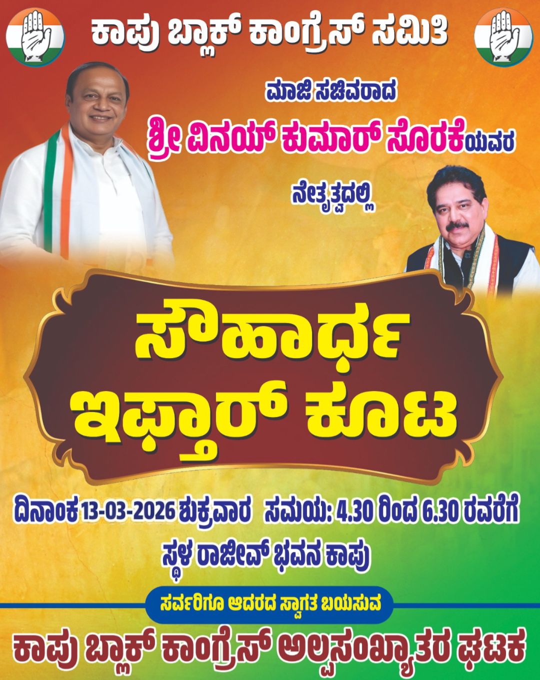 ಕಾಪು: ಕಾಪು ಬ್ಲಾಕ್ ಕಾಂಗ್ರೆಸ್ ಸಮಿತಿ ಹಾಗೂ ಕಾಪು ಬ್ಲಾಕ್ ಕಾಂಗ್ರೆಸ್ ಅಲ್ಪಸಂಖ್ಯಾತರ ಘಟಕದ ವತಿಯಿಂದ ಮಾಜಿ ಸಚಿವರಾದ ಶ್ರೀ ವಿನಯ್ ಕುಮಾರ್ ಸೊರಕೆಯವರ ನೇತೃತ್ವದಲ್ಲಿ ಸೌಹಾರ್ದ ಇಫ್ತಾರ್ ಕೂಟವನ್ನು ಆಯೋಜಿಸಲಾಗಿದೆ.