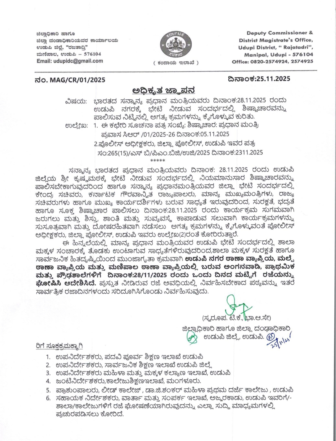 ನ. 28 ಪ್ರಧಾನಿ ಮೋದಿ ಉಡುಪಿ ಭೇಟಿ ಹಿನ್ನೆಲೆ, ಪ್ರಾಥಮಿಕ, ಪ್ರೌಢ ಶಾಲೆಗಳಿಗೆ ರಜೆ