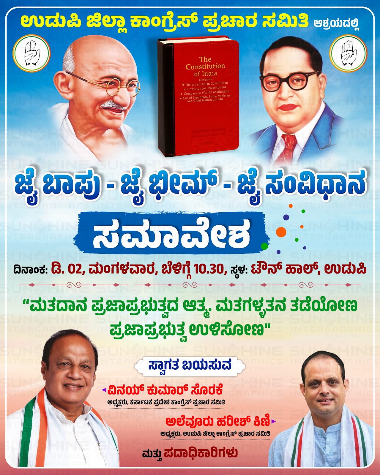 ಉಡುಪಿ ಜಿಲ್ಲಾ ಕಾಂಗ್ರೆಸ್ ಪ್ರಚಾರ ಸಮಿತಿ ಆಶ್ರಯದಲ್ಲಿ ಜಿಲ್ಲಾ ಕಾಂಗ್ರೆಸ್ ಸಮಿತಿಯ ಸಹಕಾರದಲ್ಲಿ ಜೈ ಬಾಪು, ಜೈ ಭೀಮ್,ಜೈ ಸಂವಿಧಾನ ಸಮಾವೇಶ ಡಿ. 2 ರಂದು ಬೆಳಗ್ಗೆ 10.30 ಕ್ಕೆ ಅಜ್ಜರಕಾಡು ಪುರಭವನದಲ್ಲಿ ನಡೆಯಲಿದೆ.